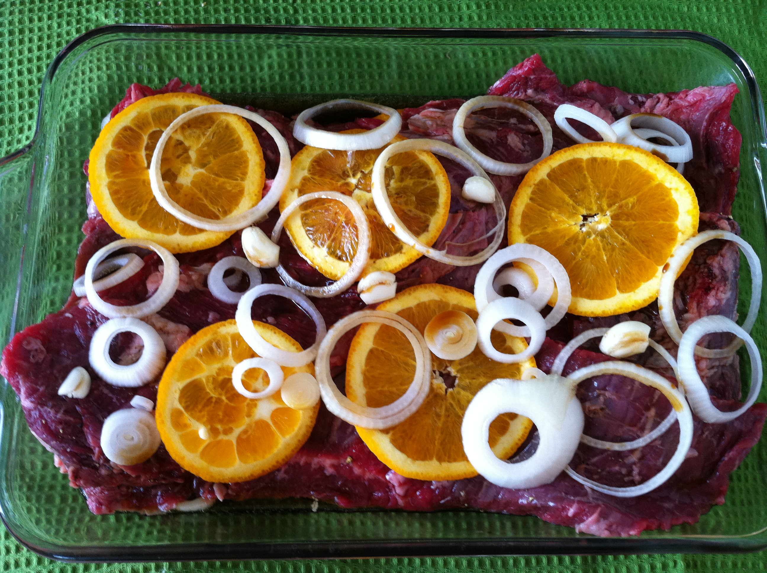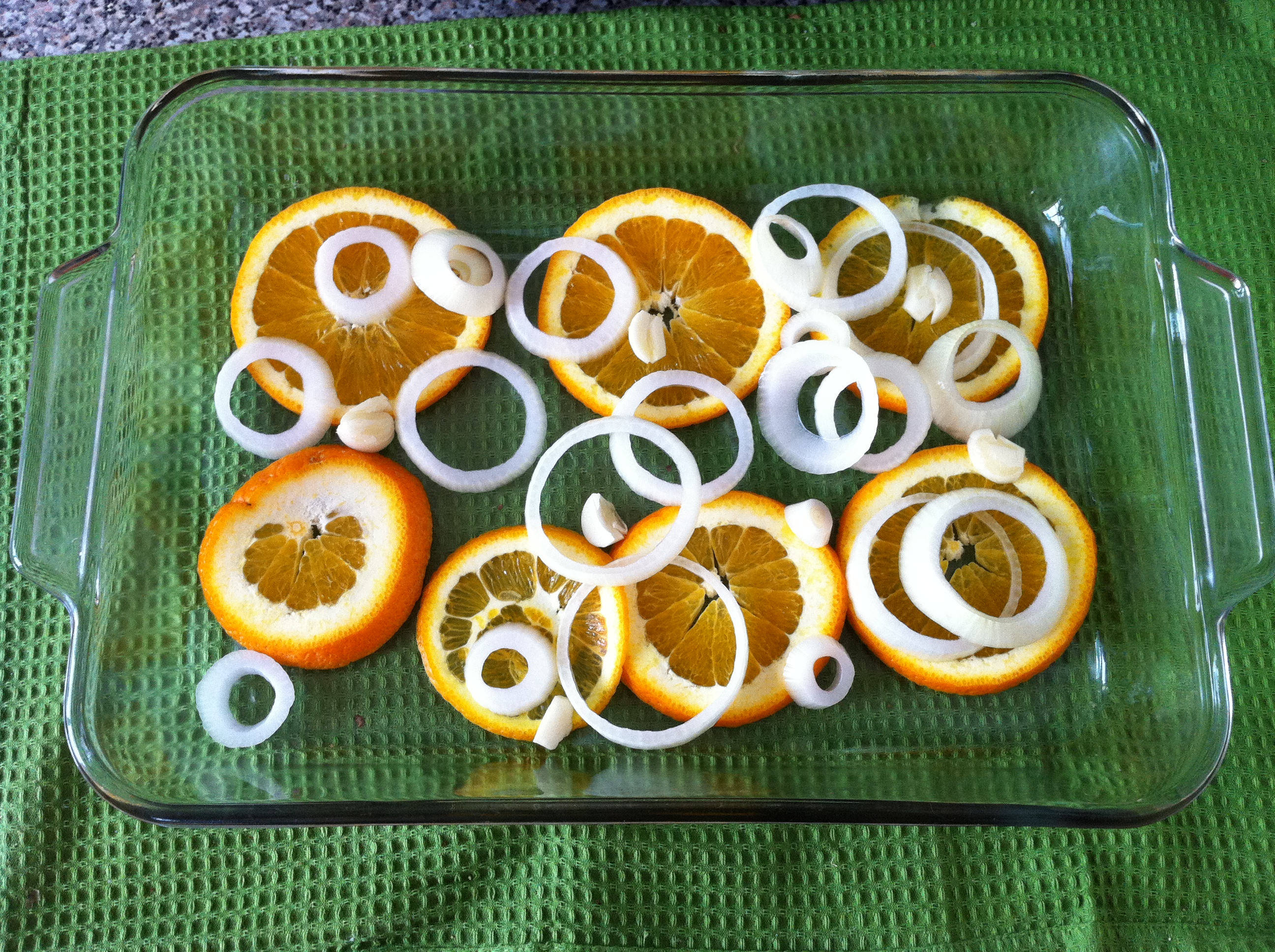 3. Preheat oven to 350°F. Pour liquid from tomatoes in bottom of baking dish.