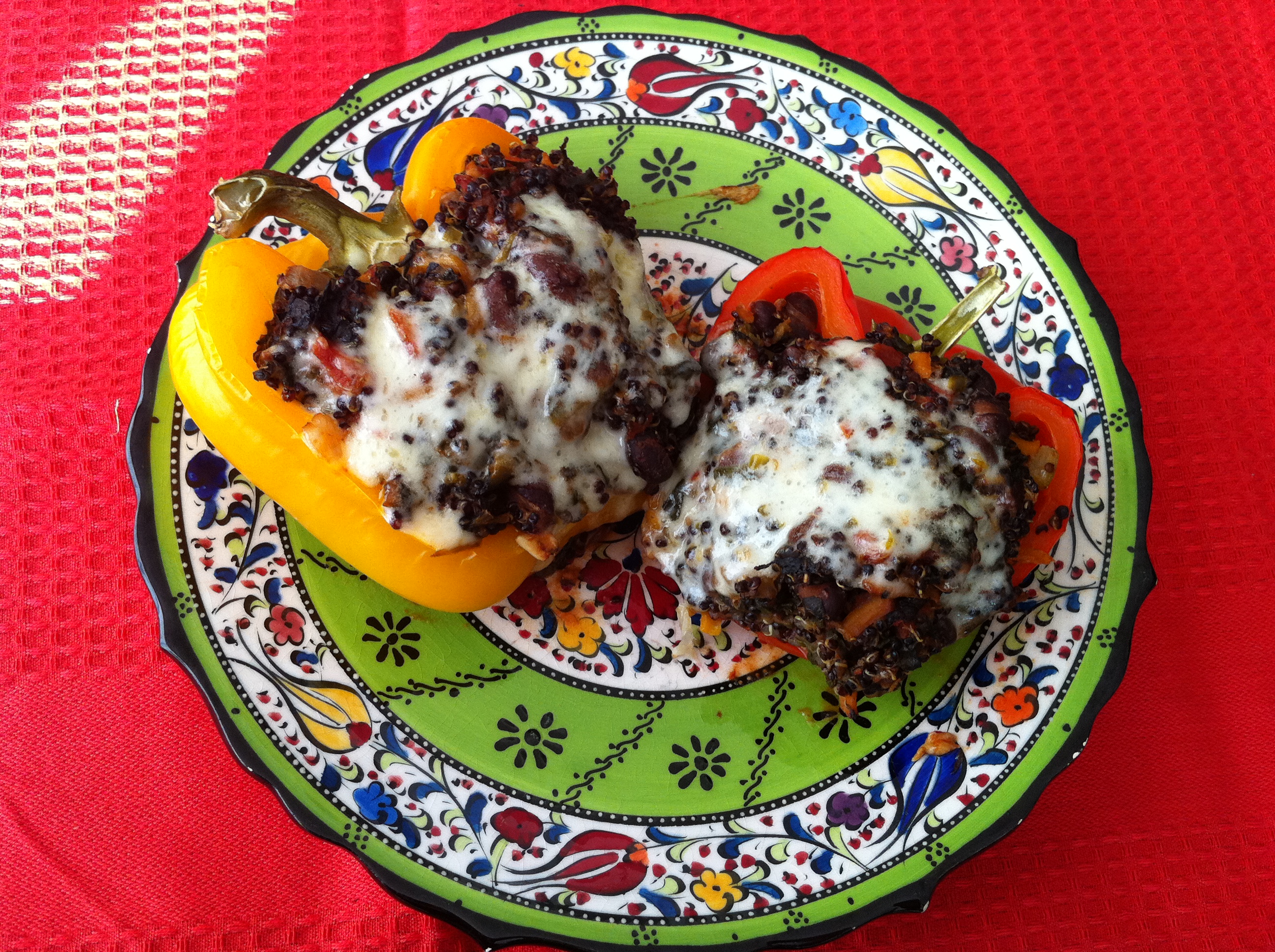 Happy Meatless Monday! Today I am featuring a truly delicioso recipe for quinoa stuffed peppers that I found while searching good old vegetariantimes.com. I am all about quinoa and have been using it more and more as my go to grain. Like most whole grains quinoa is packed with fiber, but what makes it superior to the rest is its protein content. It contains about 15g of protein per cup!