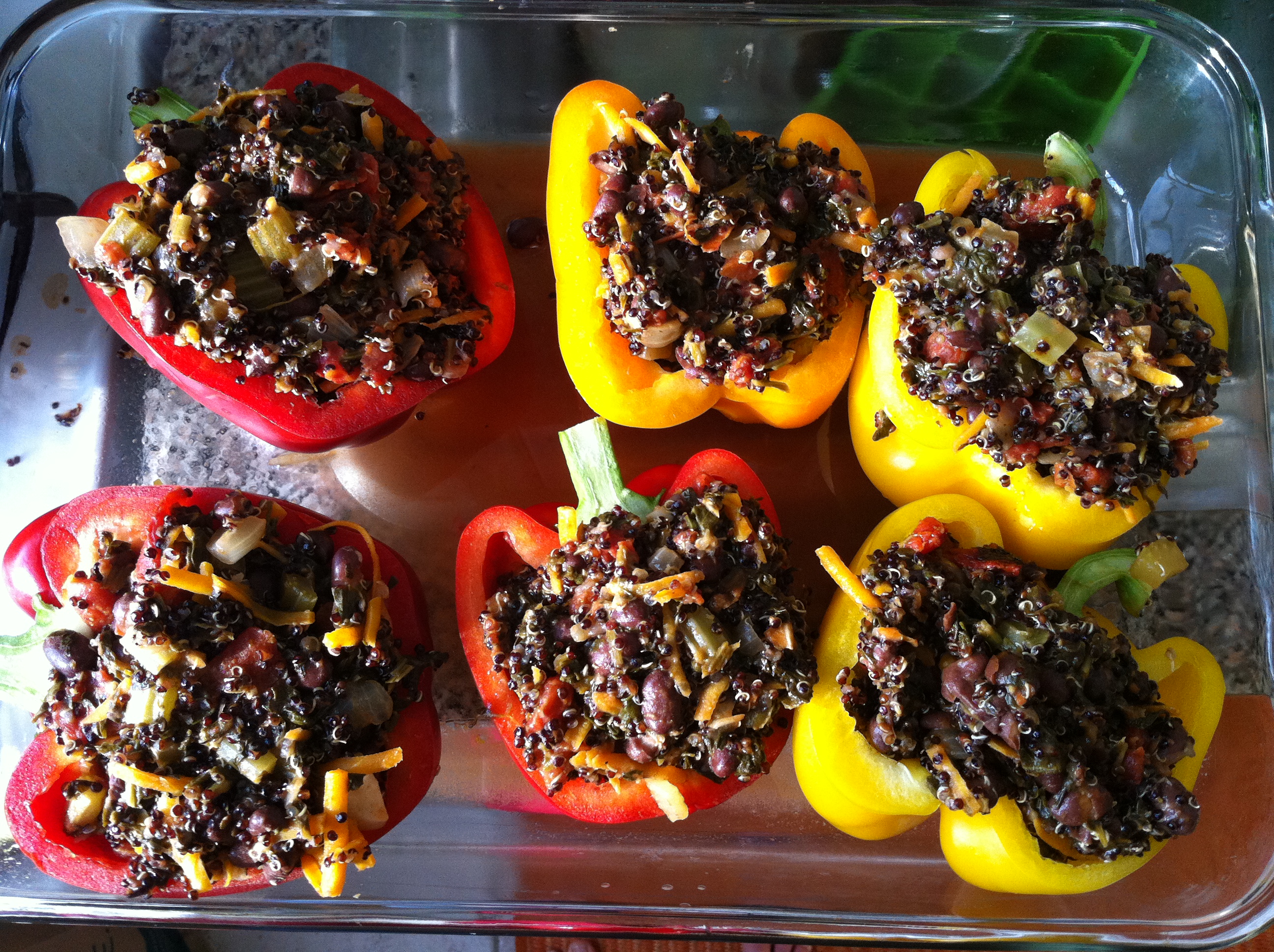 4. Fill each bell pepper half with heaping 3/4-cup quinoa mixture, and place in baking dish. Cover with foil, and bake 1 hour.